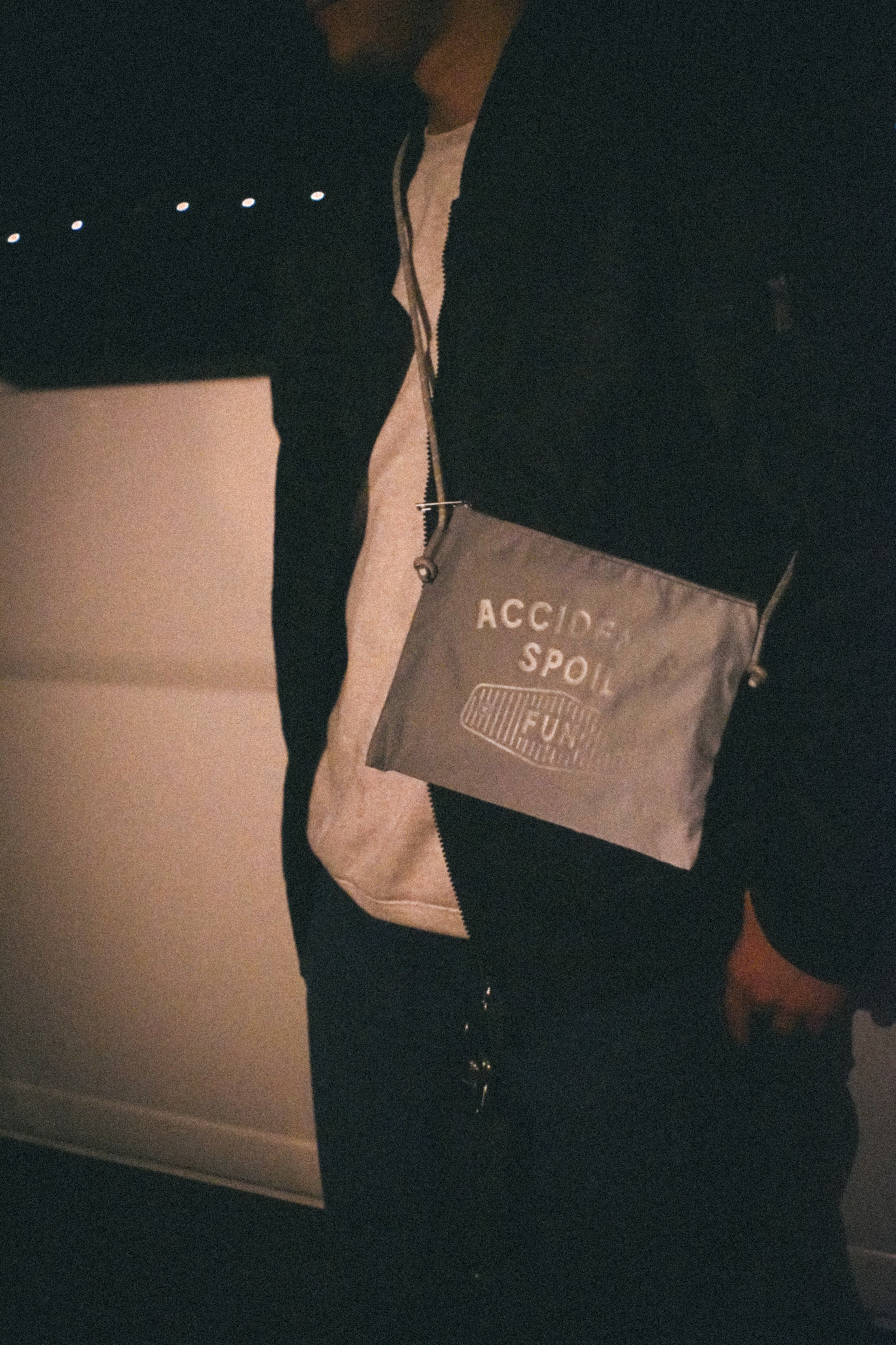 全面が暗闇で反射するリフレクター素材のサコッシュタイプのミニショルダーバッグ。
