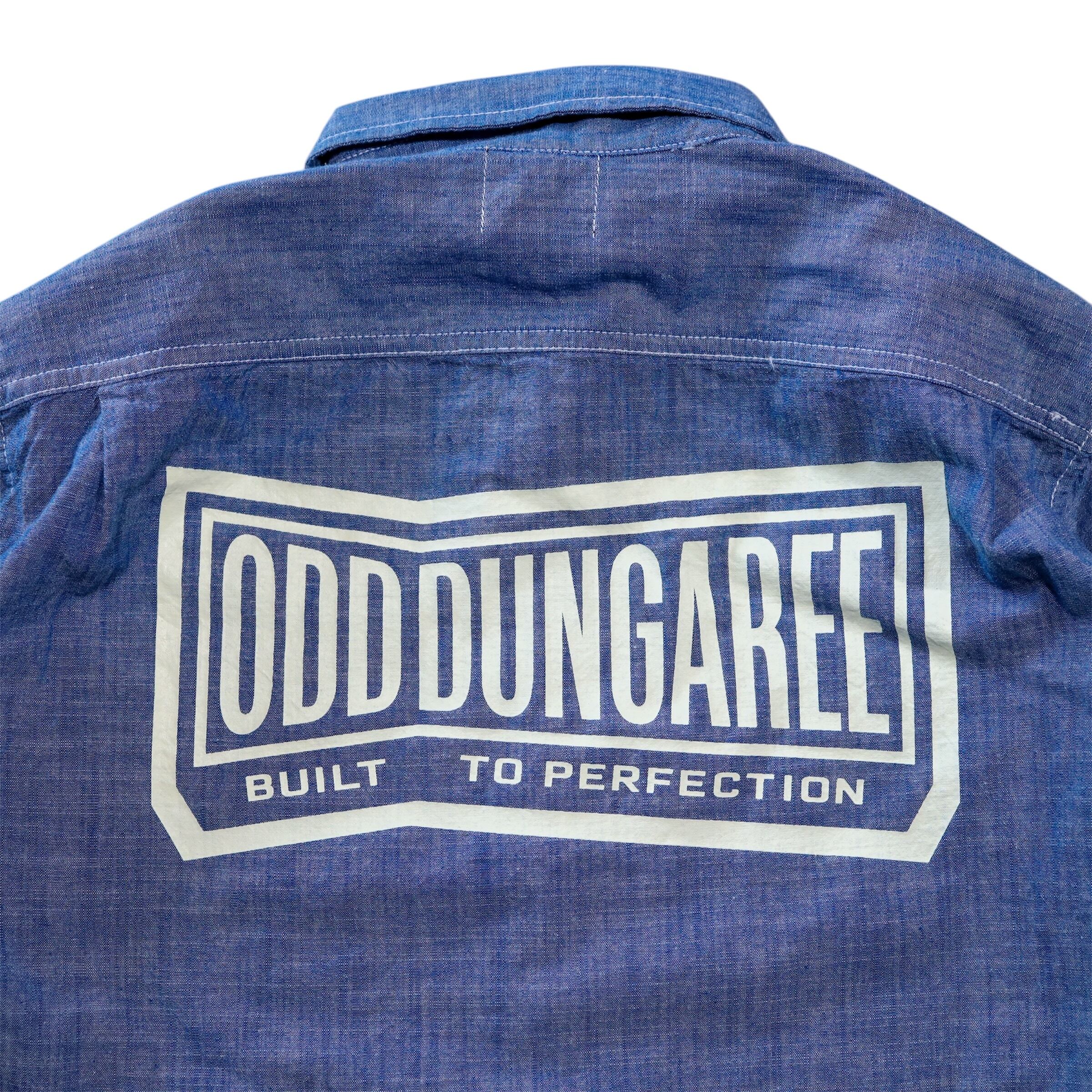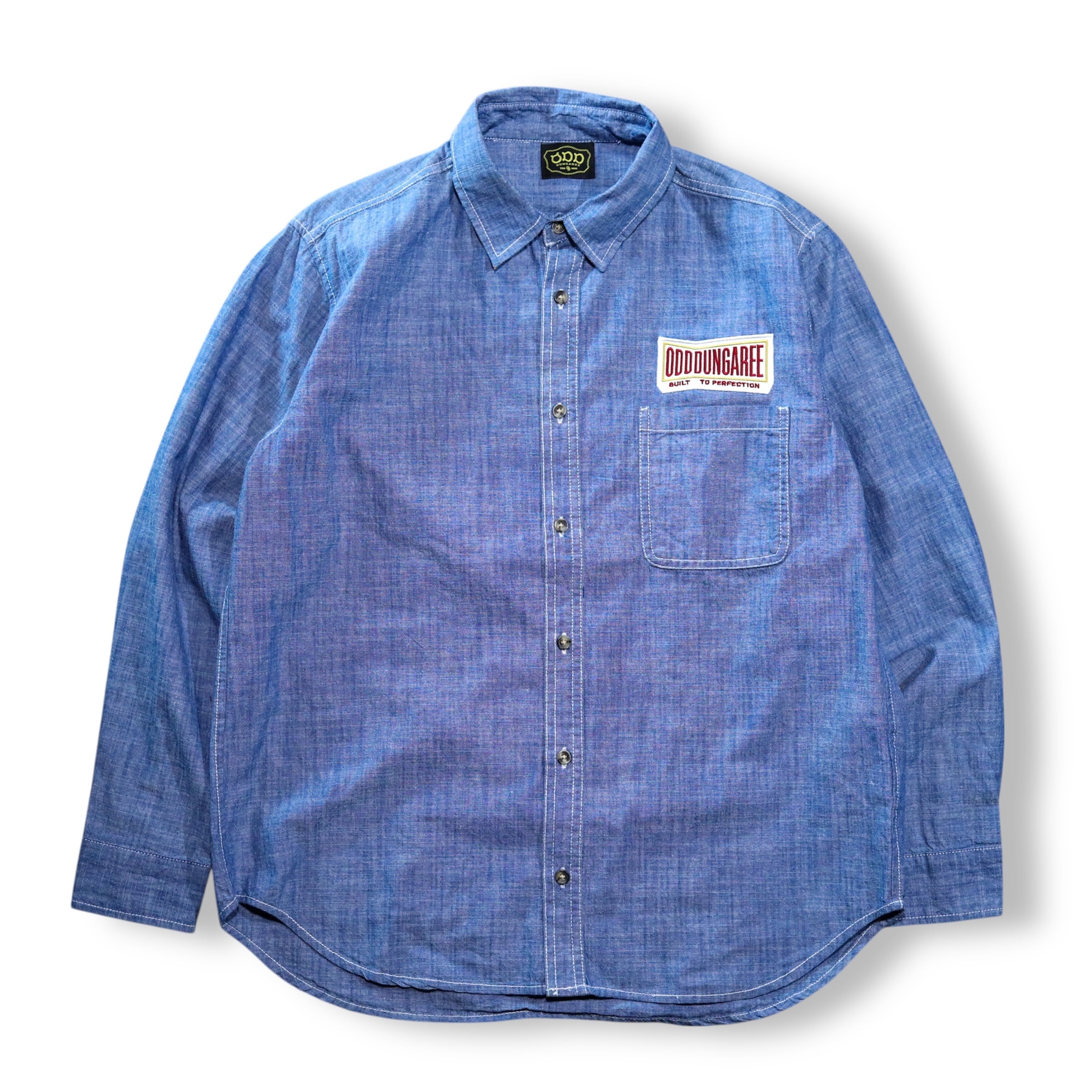 フロントチェストにワッペン、バックにシルクラバープリントを配した長袖シャンブレーワークシャツ。
