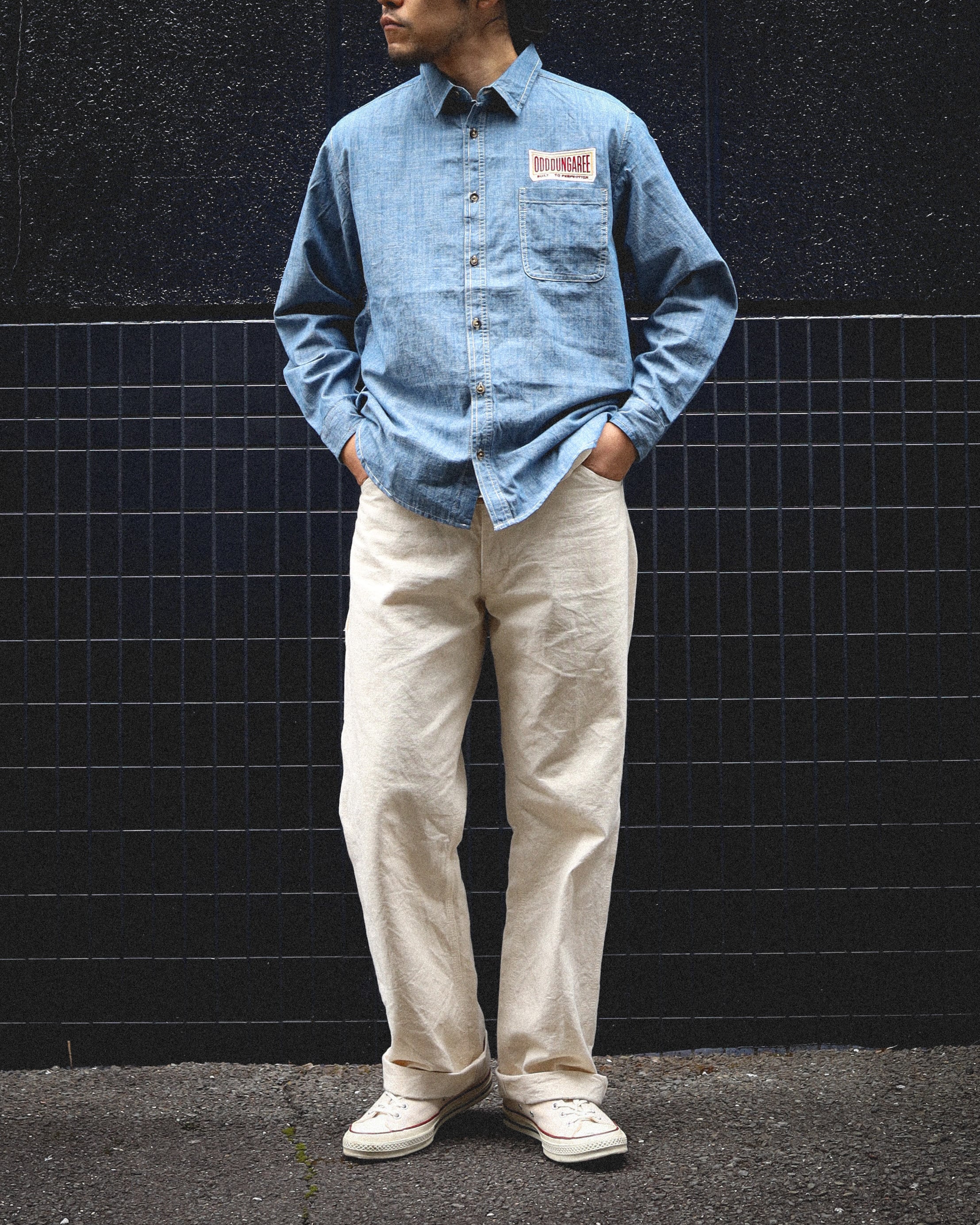 生地はコットン100%インディゴ・シャンブレー素材を使用。